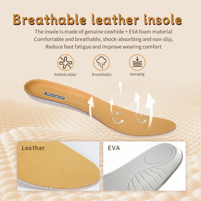 Benetako behi-larrua + EVA apar-zola: transpiragarria, kolpeak xurgatzen dituena eta irristagaitza. Oinak kilometroz kilometro fresko sentitzen ditu.